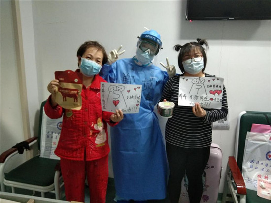 面對新冠肺炎重癥病區(qū)患者心理壓力普遍較大的情況,胡奔奔每天忙完護(hù)理工作之余,主動通過談心、跳舞、做游戲等方式對患者進(jìn)行心理疏導(dǎo),成為大家的“開心果”,使得病區(qū)氛圍大大改善,有了歡聲笑語。三八節(jié)當(dāng)天,她為病區(qū)患者送上親手繪制的“奔奔與你同在”簡筆畫,以及家鄉(xiāng)特產(chǎn)牛肉和胡辣湯,為患者加油。見到患者的笑容,成了胡奔奔最開心的事情。