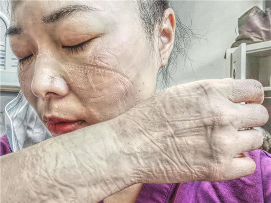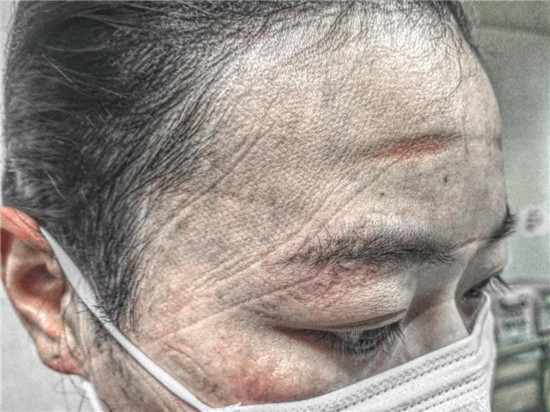 因?yàn)樾鹿诜窝椎膹?qiáng)傳染性,胡奔奔每次去病區(qū)上班都要全副武裝,而且為保證在6個(gè)小時(shí)的工作時(shí)間內(nèi)不被暴露,不能去衛(wèi)生間,不能喝水,還要穿上成人紙尿褲以防萬一。這樣下來,汗?jié)褚路浅J?,而且下班后脫掉防護(hù)裝備后,她原本清秀白皙的臉上,滿是深深的皺褶,久久難以恢復(fù),惹人心疼。給家人報(bào)平安時(shí),胡奔奔甚至不敢視頻聊天,只能語音安慰家人。
