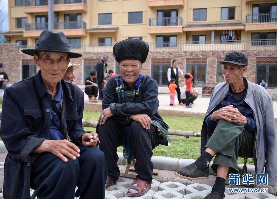 搬下山的人們,住進(jìn)了有彝族傳統(tǒng)建筑風(fēng)格的新社區(qū),老人們常聚在街邊休閑(8月11日攝)。 新華社記者 李賀 攝