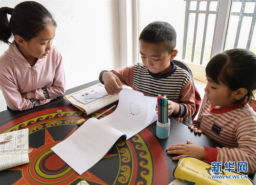 昭覺(jué)縣城城郊集中安置點(diǎn)南坪社區(qū)內(nèi),一戶(hù)彝族群眾家中的孩子圍坐在書(shū)桌旁畫(huà)畫(huà)(8月11日攝)。 新華社記者 李賀 攝