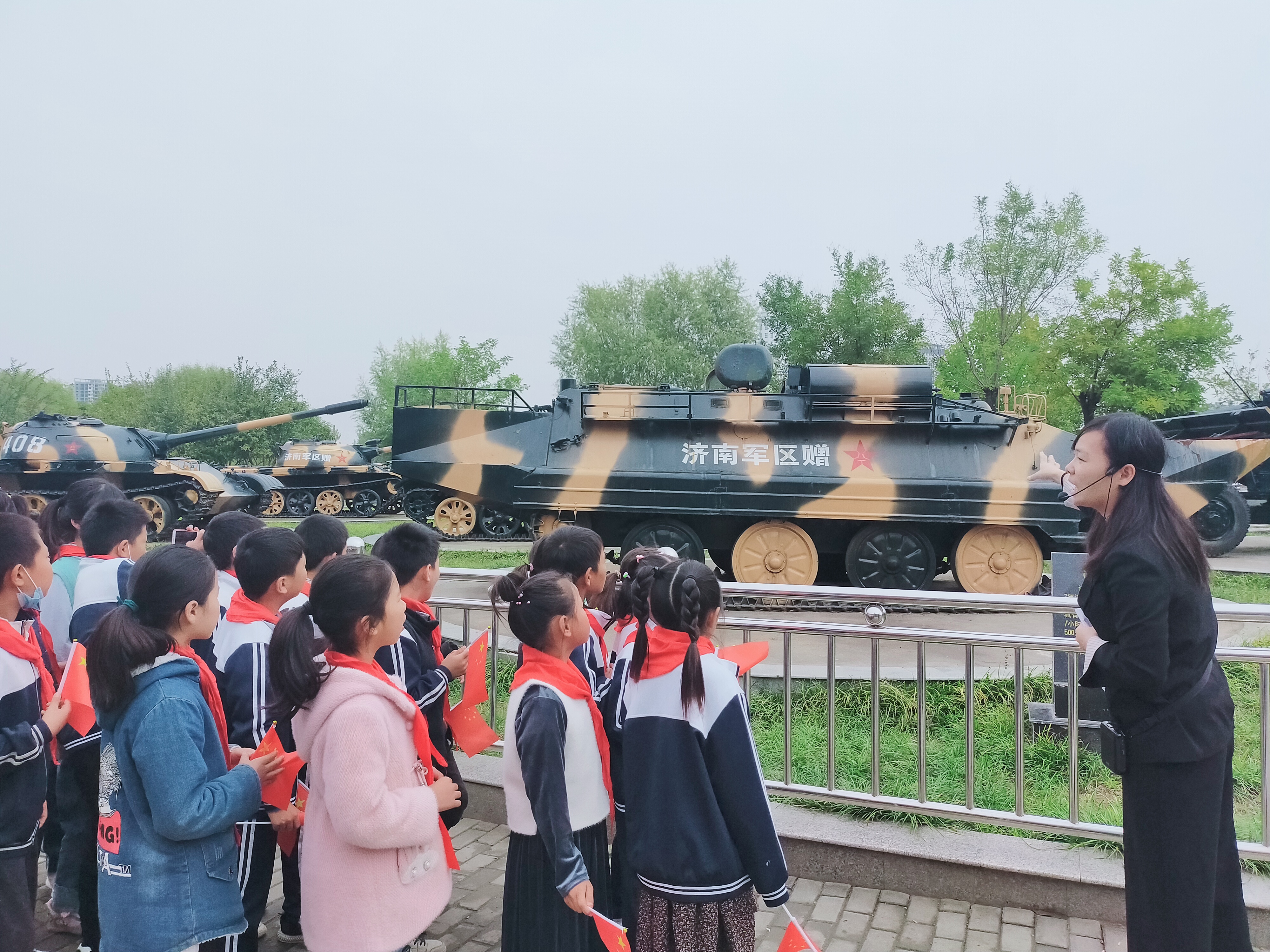 當日10時許,在講解員的帶領下,學生們在周口國防園參觀了坦克、火箭炮、榴彈炮、高射炮、飛機等軍事裝備,增長了國防知識,受到了愛國主義教育。隨后,在主辦方志愿者的帶領下,學生們在軍艦旁齊唱國歌共同慶祝祖國生日。