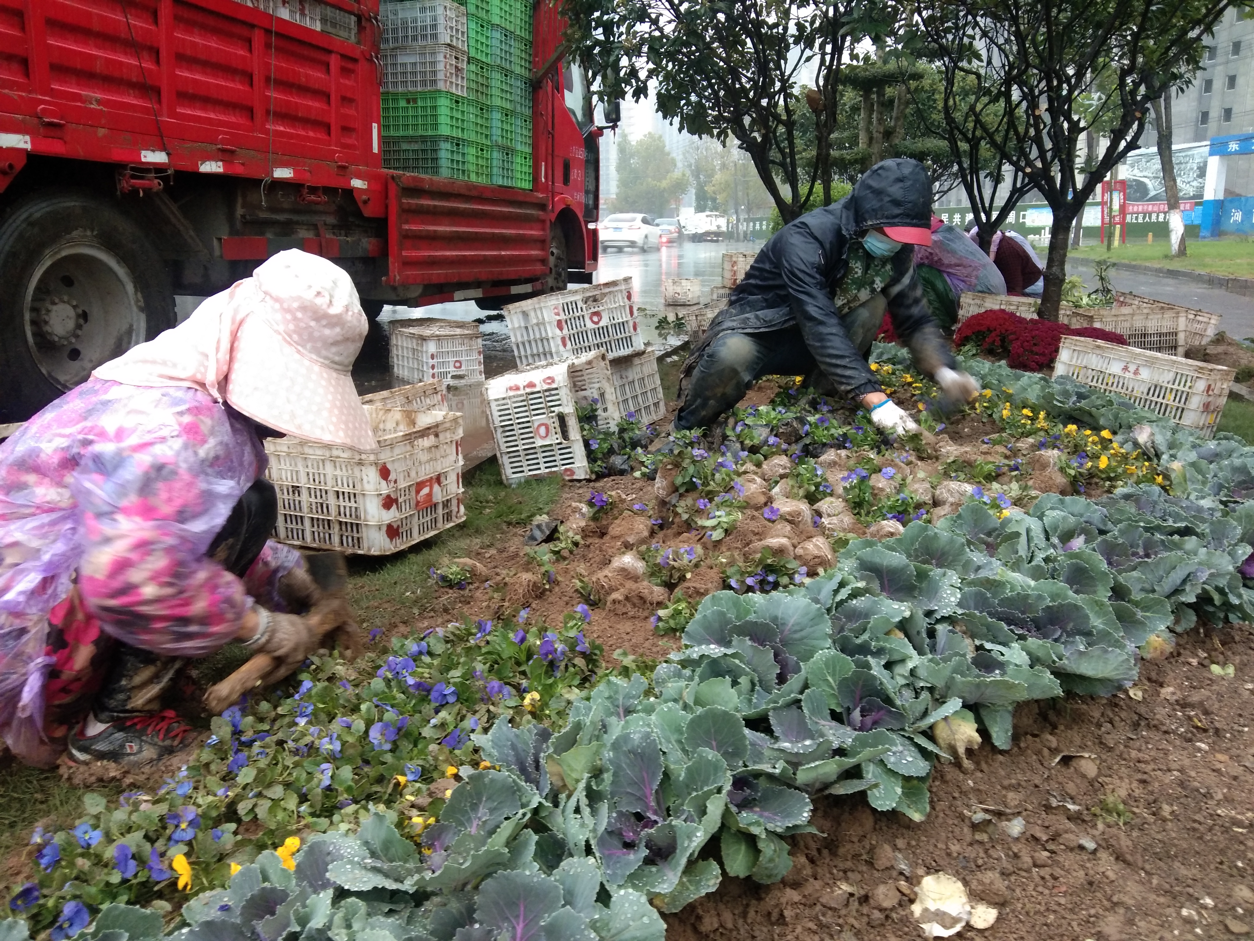10月14日早晨,記者在周口中心城區(qū)七一路東段看到,幾名園藝工人正在道路邊的綠化帶內(nèi)栽種黃色、紫色的花兒。當(dāng)日,周口中心城區(qū)下起了淅淅瀝瀝的小雨,可是園藝工人卻全然不顧這些,抓住有利時機(jī)栽種花木,提高存活率,助力“創(chuàng)文”。記者 張洪濤 攝