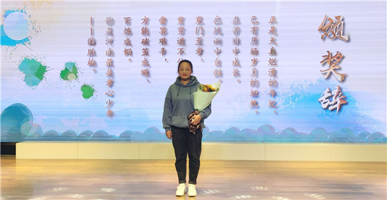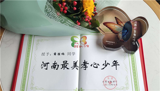 “正是天真爛漫的年紀,已有歷經(jīng)歲月的坦然。在苦難中成長,在風雨中自強。寒門至孝,貧窮遮不住你內(nèi)心的光芒。嘗罷艱辛,方能破繭成蝶、百煉成鋼。你是‘河南最美孝心少年’——薛勝楠?!边@是組委會給薛勝楠的頒獎詞。