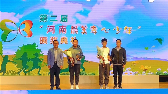 10月20日,河南省第二屆“河南最美孝心少年”頒獎典禮在河南省實驗學校鄭東小學舉行,全省表彰10名“河南最美孝心少年”,分別頒發(fā)獎杯、證書和1萬元獎勵。省教育廳副廳長毛杰等領(lǐng)導(dǎo)為孝心少年頒獎并合影留念。鄲城縣汲水二中學生薛勝楠光榮受獎。