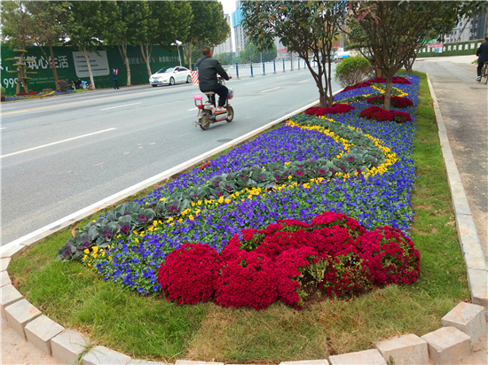 紅色、黃色、紫色的花兒,還有造型別致的景觀樹……10月21日,記者在周口中心城區(qū)七一東路上的一處綠化帶內(nèi)看到了這樣一組造型別致的景觀造型,扮靚了綠化帶,給人耳目一新的感覺。記者 張洪濤 攝