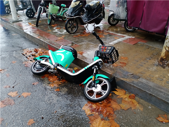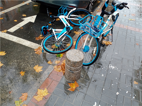 11月18日上午,記者在周口中心城區(qū)育新街和建安路上看到,一些共享單車被隨意放在路邊,造成一定交通隱患。①15
