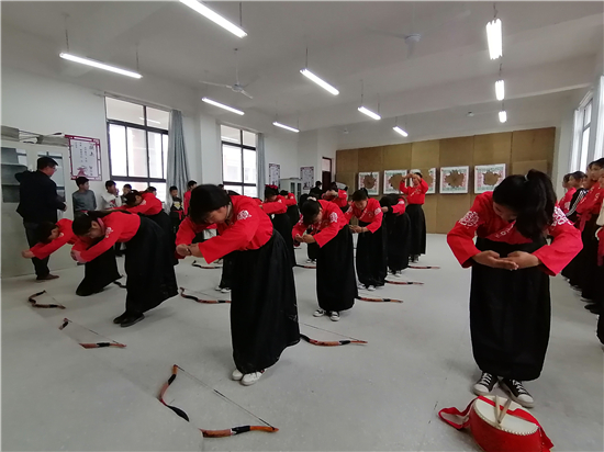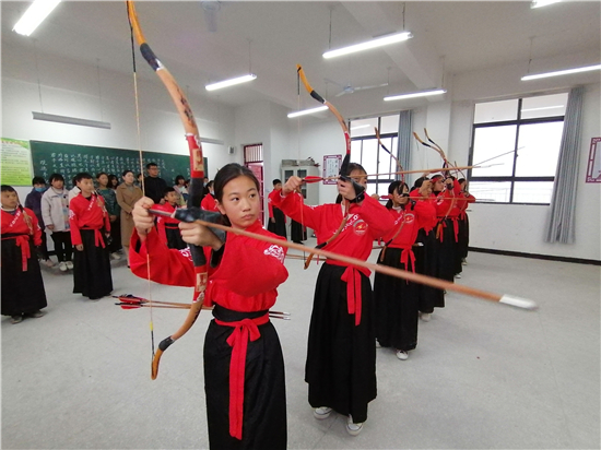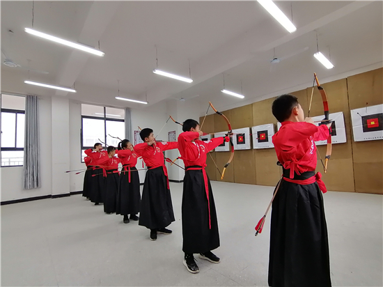 在皮營學校活動室,學校舞蹈社團的小朋友展示了傳統儀式《鹿鳴》,深情的演繹,展示了他們對國學經典的理解。禮射是禮樂文明重要組成部分,習射先習禮,射以觀德。習射可以強健體魄,其中還蘊含了眾多古人先賢的智慧。皮營學校禮射興趣班的小朋友進行禮射表演,隨著挾矢,正筈,審固,舉弓,引彀,發(fā)矢,斂弓,執(zhí)弦等一系列指令,拈弓搭弦展示禮射八法。在這里,學生們通過不同方式的展示,詮釋自己對“禮”“樂”的理解和認知。