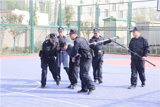 在法警大隊訓(xùn)練場,考核組一行觀看了擒敵拳和警械具使用、處置突發(fā)事件等實戰(zhàn)應(yīng)用。在處突演練過程中,5人組成的處突小組模擬各種突發(fā)情況進行實戰(zhàn)演練,法警們反應(yīng)迅速,執(zhí)法規(guī)范,短短數(shù)秒內(nèi)就將"暴徒"制服。