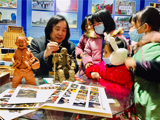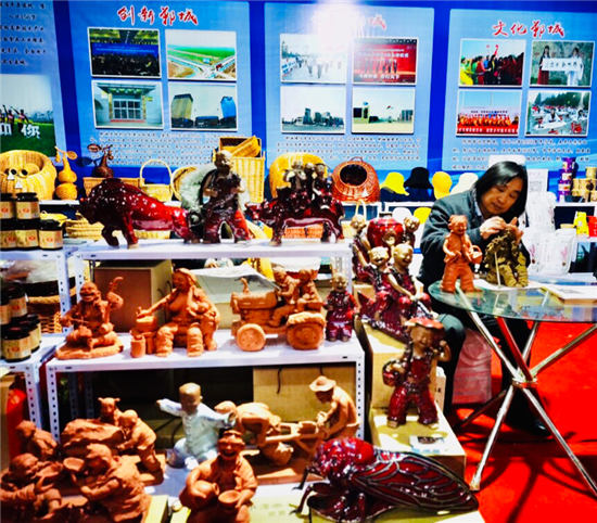 鄲城縣泥塑藝術(shù)大師張振福應(yīng)邀攜48件作品參加大會(huì),成為展會(huì)的一大亮點(diǎn)。其中原生態(tài)泥塑作品18件,有《磨豆汁》《耕耘》《酒逢知己》《二胡曲》等,鈞瓷泥塑作品20件,有《大金蟬》《年年有余》《豫東娃》《瑞牛迎春》等。張振福的作品表現(xiàn)豫東的鄉(xiāng)村人物,作品突出個(gè)性,憨態(tài)可掬,深受觀眾的喜愛,大家紛紛駐足觀看。