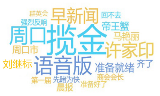 網絡熱詞反映了網民關注的重點,詞云圖中大大的“攬金”二字占據詞云圖中央,可見攬金是真的攬金,據悉,首屆周商大會簽約項目31個,總投資達429.7億元人民幣。“許家印”“馬艷麗”在整個圖中也是光彩奪目,作為周口人,走上北上廣深的成功人士還心心念念家鄉(xiāng)的發(fā)展,讓老鄉(xiāng)們倍感溫暖,家鄉(xiāng)人關注他們?yōu)榧亦l(xiāng)發(fā)展做出的努力和他們的動態(tài)也是再正常不過了。