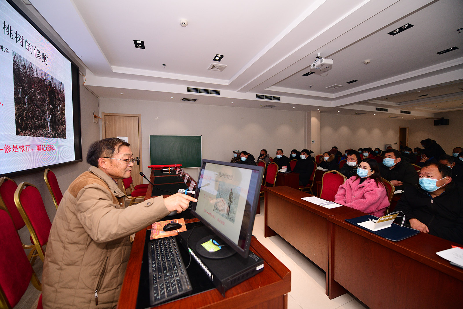 22日8時許,首節(jié)課程由周口市職業(yè)技術(shù)學(xué)院果樹種植專家、教授曹德玉講授果樹高效栽培技術(shù)。曹德玉教授是我市果樹種植管理方面的專家,也是行業(yè)學(xué)術(shù)技術(shù)帶頭人。在培訓(xùn)班上,他針對桃樹剪枝及不同季節(jié)的果樹管理、施肥等方面技術(shù)做成課件,以圖文并茂的形式對果農(nóng)進(jìn)行深入淺出地講解。下午,曹德玉教授還來到園藝場果園內(nèi),現(xiàn)場開展果樹剪枝實(shí)用技術(shù)示范培訓(xùn)。