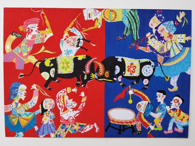 2020年4月,錢玉燕無(wú)意中看到“決勝全面小康”第二屆全國(guó)農(nóng)民畫展覽征稿啟事,對(duì)農(nóng)村生活非常熟悉的她決定一試。她立足于周口平原農(nóng)區(qū)的特色,深深領(lǐng)悟周口幾千年來(lái)的農(nóng)耕文化,對(duì)參賽作品進(jìn)行了認(rèn)真、系統(tǒng)地構(gòu)思,最終決定以歡慶豐收的斗?;顒?dòng)為題材,把農(nóng)耕文化的深遠(yuǎn)、厚重與豐富的藝術(shù)表現(xiàn)手法相融合。她采用普通的繪畫卡紙,運(yùn)用多種繪畫顏料,充分借鑒漢畫藝術(shù),吸收中原地區(qū)的剪紙文化、西方藝術(shù)大師畢加索立體畫派的藝術(shù)風(fēng)格和古埃及畫的靈感,以艷麗的紅、藍(lán)為主背景,采取夸張的表現(xiàn)手法,把斗牛的場(chǎng)景表現(xiàn)得淋漓盡致。作品創(chuàng)作發(fā)揮了豐富的想象力,人物動(dòng)物造型借鑒中國(guó)民間藝術(shù)剪紙的方式表現(xiàn),以大膽、夸張、強(qiáng)烈的色彩搭配,把無(wú)限深廣的空間“壓扁”到一個(gè)平面上。
