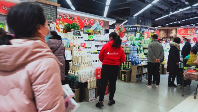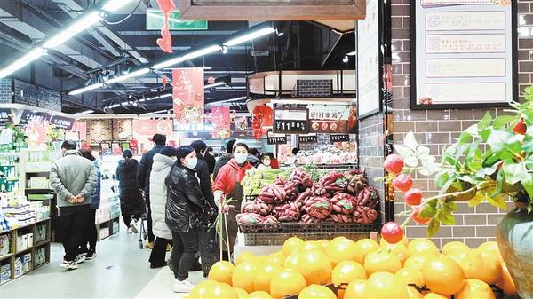 春節(jié)日益臨近,我市中心城區(qū)的各大超市充滿了濃濃的年味兒。1月26日,記者走進一家超市看到,各類商品擺滿了貨架,糧油、糖品、干貨、生鮮、熟食、水果等品種豐富,一應(yīng)俱全,過年的氛圍十分濃厚。