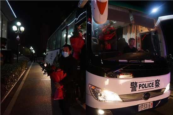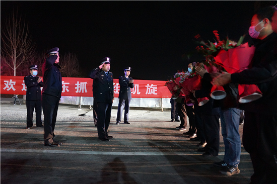 英雄凱旋,鮮花致敬。2月6日夜晚11時(shí)許,寧洛高速項(xiàng)城北收費(fèi)站警燈閃爍、隊(duì)列整齊,項(xiàng)城市公安局在這里隆重舉行儀式,熱烈歡迎 “1.8”專案組民警勝利歸來。副市長、公安局長萬東偉,局黨委副書記、副局長陳重,局黨委委員、政辦室主任衛(wèi)偉,局黨委委員袁啟峰等領(lǐng)導(dǎo)出席儀式,部分民警代表參加了儀式。萬東偉同志代表局黨委對此案的成功偵破表示熱烈祝賀,真誠感謝專案組民警的辛勤付出,并向大家致以崇高的敬意。
