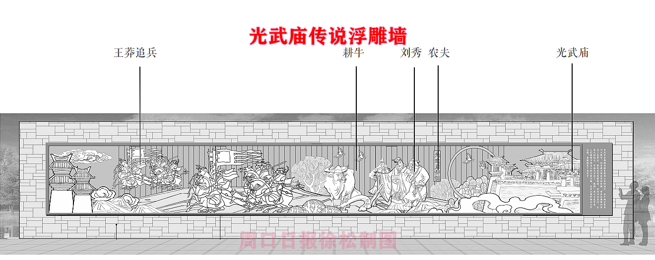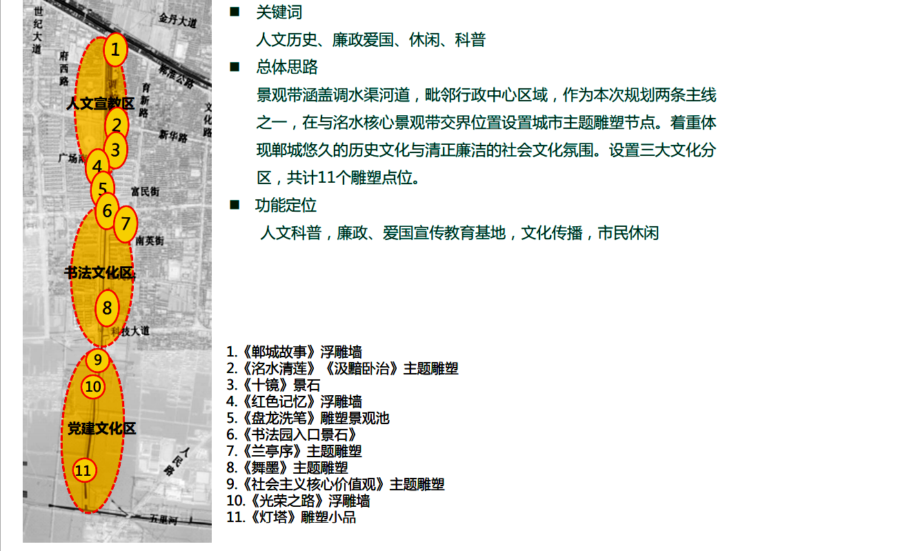在縣委、縣政府綜合大樓東側(cè)的核心形象段,配合鄲城行政中心打造莊嚴、大氣氛圍的同時,對鄲城歷史文化進行了集中展示,包括鄲城的歷史沿革,鄲城的發(fā)展理念,歷史故事等。其中調(diào)水渠西側(cè)以現(xiàn)有人民廣場對應(yīng)的綠地為基礎(chǔ),設(shè)置了較多的歷史文化節(jié)點。如調(diào)水渠新華路橋頭北側(cè)的廉政文化廣場,講述了漢朝名臣汲黯的故事。汲黯為人耿直,直諫廷諍,親政愛民,敢于承擔(dān)責(zé)任,漢武帝劉徹稱其為“社稷之臣”。汲黯廉政廣場建設(shè)在此處更有著深遠的意義,它一方面提醒老百姓要了解歷史、敬畏先賢,同時也激勵著鄲城縣的各級黨員干部要在習(xí)近平新時代中國特色社會主義思想引領(lǐng)下,“不忘初心、牢記使命、廉潔奉公、一心為民”。