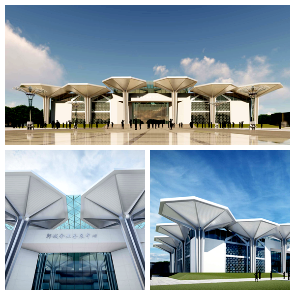 其中,傘業(yè)產業(yè)園電子商務服務中心項目由中國一冶承建,會展中心的設計概念以“傘啟鄲興”為主題,基于對本土特色文化的深入解讀、同時結合“傘”的具體特征,提煉傘蓋、傘骨、傘柄的特殊形象為基本元素。建筑主立面以八個巨大傘形構架依次展開,巨型的尺度、新穎的造型有極強的昭示性,裝飾幕墻八邊形的單元分割也隱喻了傘蓋的造型,創(chuàng)新的視覺形象為傘業(yè)產業(yè)園增加了新的注解。會展中心整體的建筑風格充分展示了鄲城傘業(yè)產業(yè)園的核心價值,形成獨具特色的地標形象。