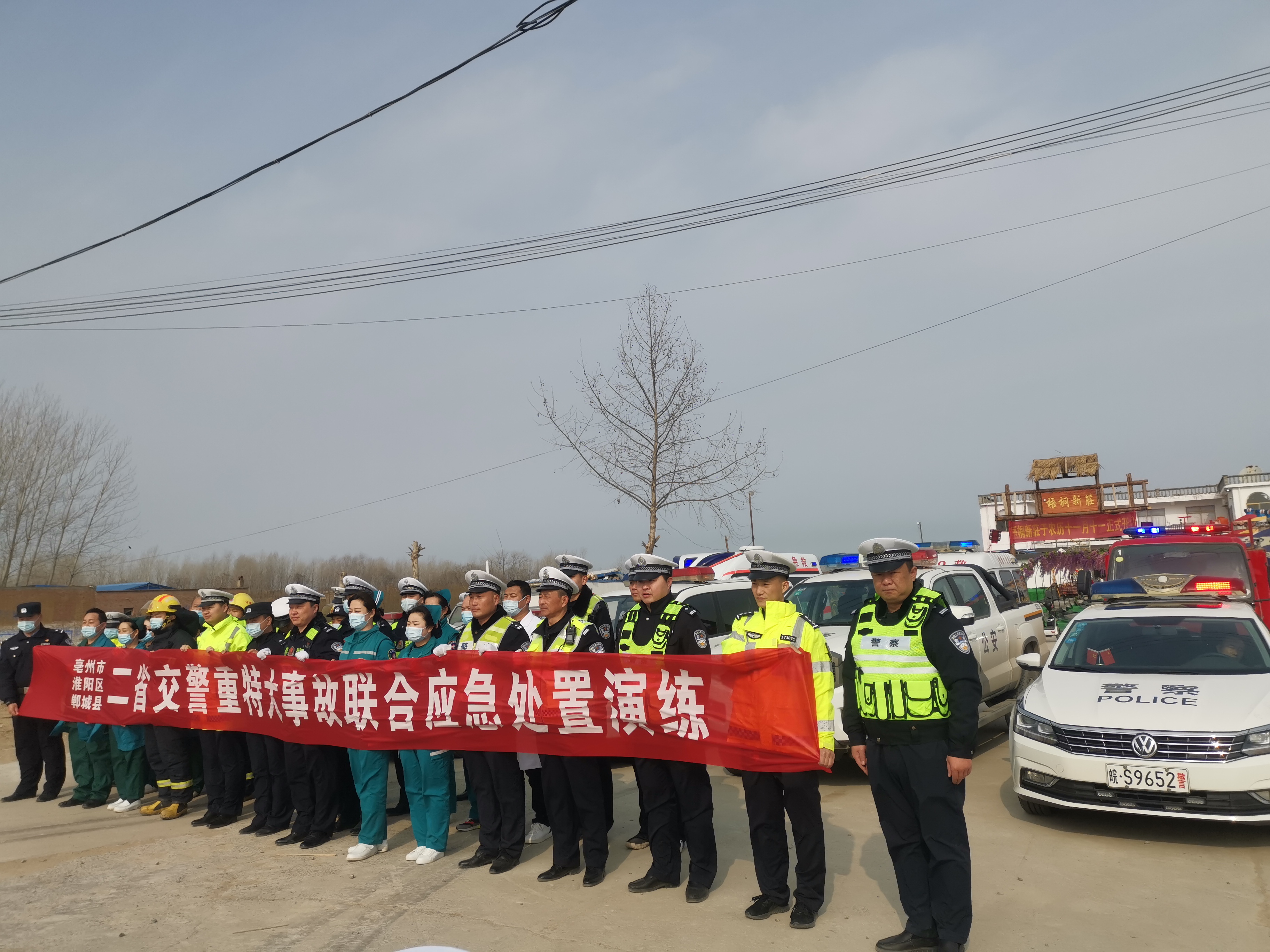為提高冬季惡劣天氣條件下突發(fā)道路交通事故應急處置能力、各部門之間的協(xié)同作戰(zhàn)以及應急指揮系統(tǒng)的組織協(xié)調(diào)能力,最大限度減少因交通事故導致的人員傷亡,確保人民群眾生命財產(chǎn)安全,鄲城縣公安交通警察大隊聯(lián)合淮陽區(qū)公安交通警察大隊和安徽省亳州市公安交通警察支隊四大隊雙溝中隊,及鄲城縣公安局南豐鎮(zhèn)派出所,應急管理、鄲城縣麗清醫(yī)院,鄲城縣中心醫(yī)院,道路基金救助辦公室等部門開展了道路交通事故快速發(fā)現(xiàn)、及時救援、有效救治、妥善救助的“四位一體”聯(lián)動型應急處置演練活動。