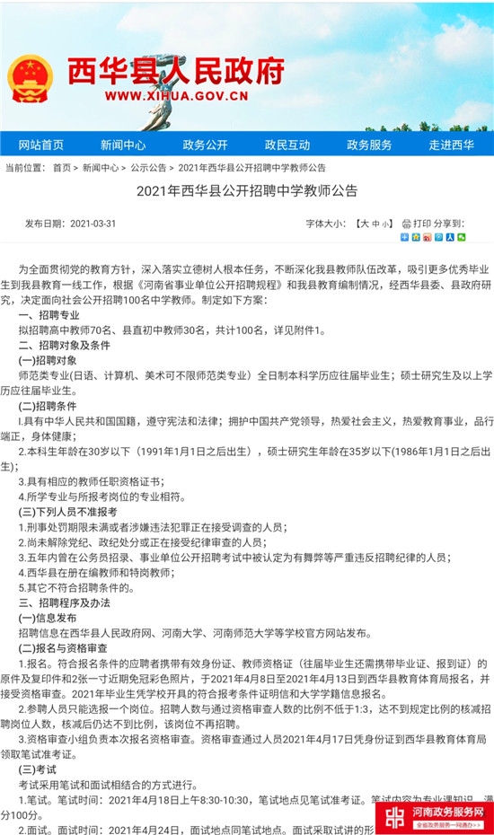 4月8日,記者從西華縣人民政府網(wǎng)站獲悉,為全面貫徹黨的教育方針,深入落實(shí)立德樹人根本任務(wù),不斷深化西華縣教師隊(duì)伍改革,吸引更多優(yōu)秀畢業(yè)生到西華教育一線工作,根據(jù)《河南省事業(yè)單位公開招聘規(guī)程》和西華縣教育編制情況,經(jīng)西華縣委、縣政府研究,決定面向社會公開招聘100名中學(xué)教師。