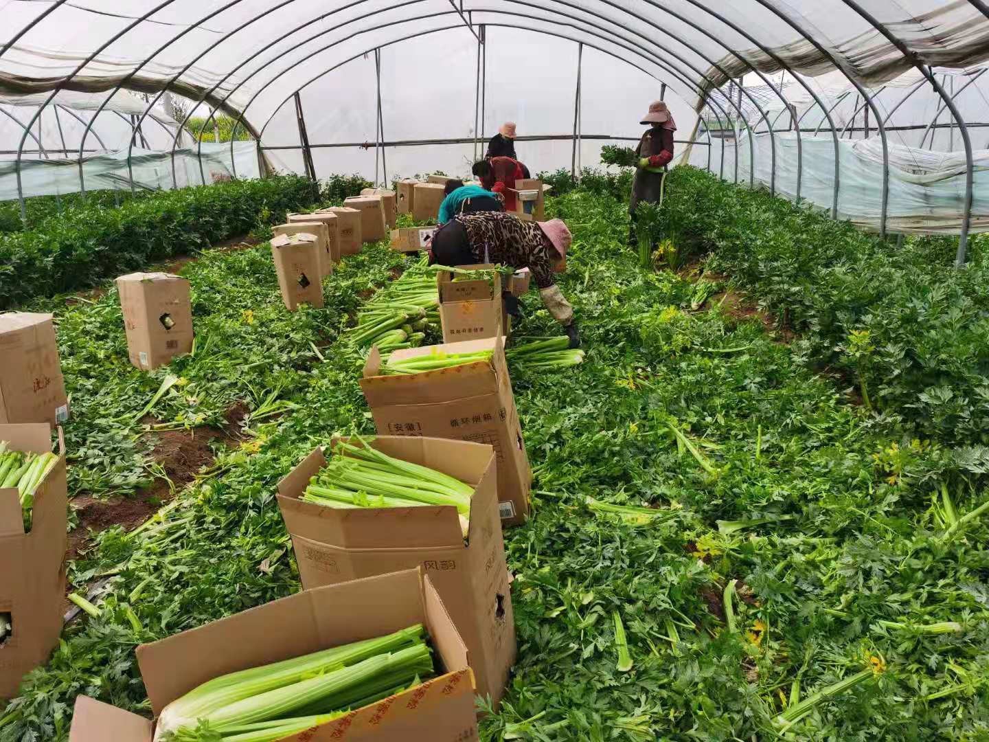 走進(jìn)萬畝芹菜種植基地蔬菜溫棚,一股傘形科植物特有的芳香充滿鼻腔。抬眼一瞅,裝箱好的芹菜整齊碼放成垛,溫棚深處,還有大片未收割的芹菜,挺直鮮嫩,綠意蔥蘢。大棚里菜農(nóng)們收割、打包、貼二維碼一氣呵成,道路兩旁十幾名從全國(guó)各地趕來的收購商從菜農(nóng)手中接過包裹急忙裝車。