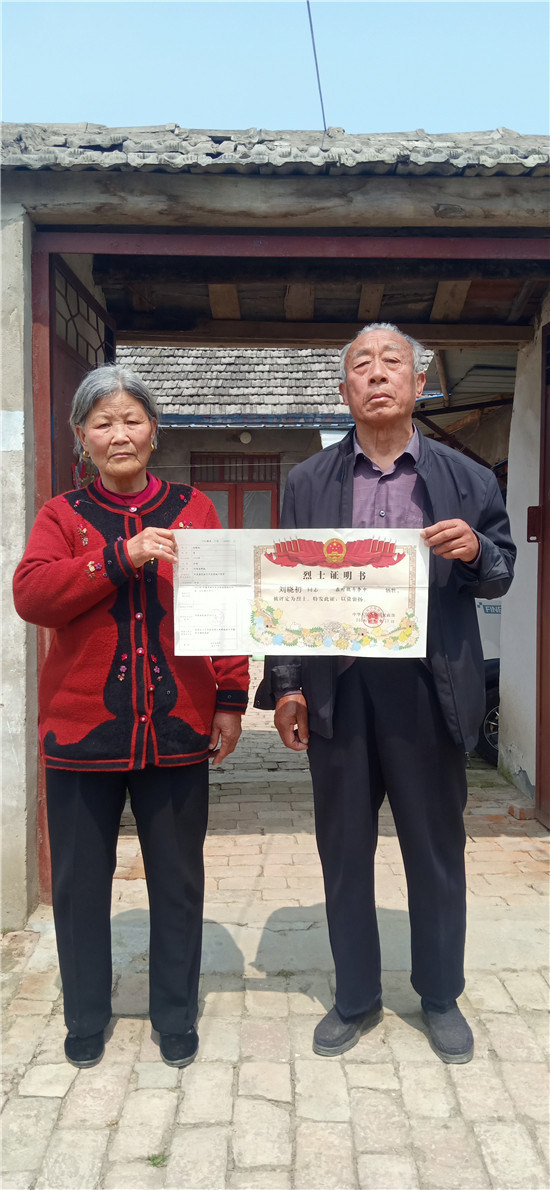 圖片說明:劉仰生夫婦展示父親劉曉初的烈士證明書