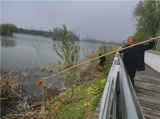 4月16日,周口植物園管理人員及保潔人員在打撈漂浮在湖水中的垃圾及枯草。為了給市民提供一個(gè)干凈、優(yōu)美的園內(nèi)環(huán)境,植物園的工作人員每天都會(huì)清理打撈湖水中的雜物。