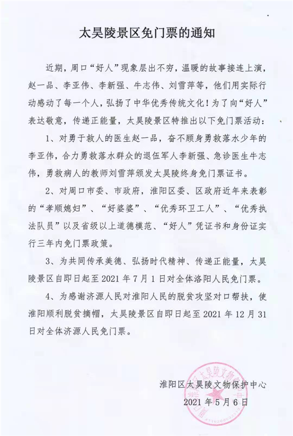 同時,為共同傳承美德、弘揚(yáng)時代精神、傳遞正能量,太昊陵景區(qū)自即日起至2021年7月1日對全體洛陽人民免門票;為感謝濟(jì)源人民對淮陽人民的脫貧攻堅(jiān)對口幫扶,使淮陽順利脫貧摘帽,太昊陵景區(qū)自5月6日起至2021年12月31日對全體濟(jì)源人民免門票。②7
