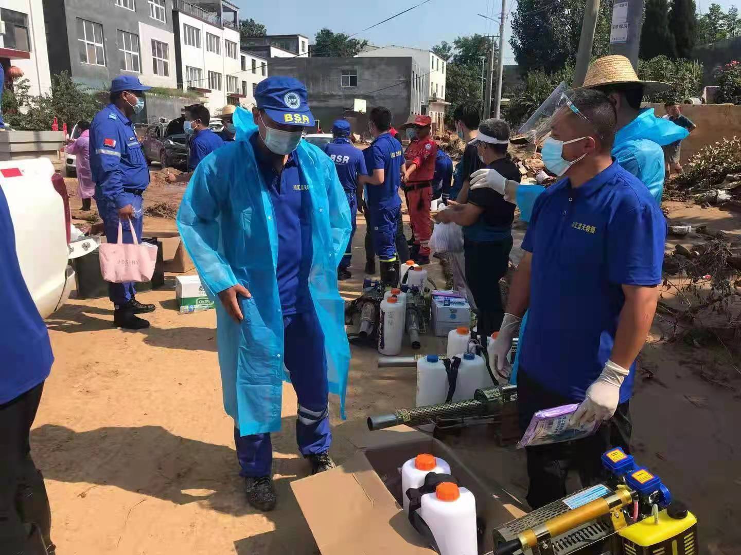 7月29日上午10時,在隊長肖永德的帶領下,周口川匯藍天救援隊30名隊員趕赴鄭州滎陽受災較重的賈峪鎮(zhèn)賈峪村進行災后消殺工作。