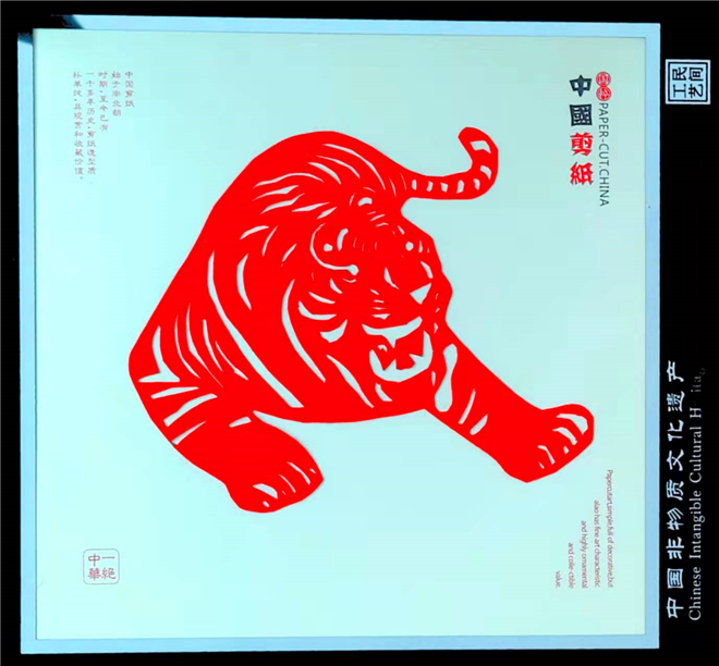 為了慶?;⒛辏醮好穭?chuàng)作的秸稈畫主要有《威震九霄》《虎之王者》《飛天神虎》等,此外,她還創(chuàng)作了兩幅剪紙作品,分別是《虎年組圖》和《虎之2022》。和剪紙作品相比,秸稈畫制作工序更加復雜,全憑手工完成,充分利用秸稈本身的紋理和質(zhì)地,結合顏色、溫度的變化,將畫面立體的呈現(xiàn)出來。其中,她創(chuàng)作的部分作品結合了唐卡的相關風格和顏色配比,比如《威震九霄》中虎的形象所表現(xiàn)出來的力量感借鑒了唐卡中護法的力量感;《虎之王者》和《虎之2022》中對于藍色的運用結合了唐卡中的藍色,代表了永恒不變,如同穹蒼攬護萬物之意。
