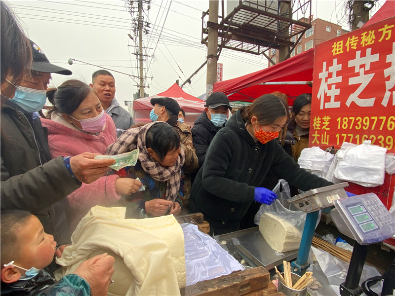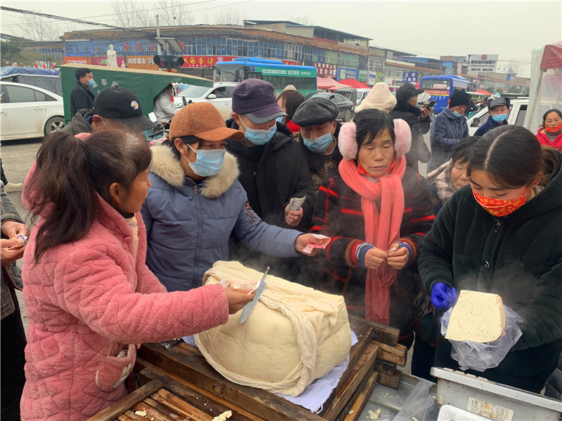 在固墻鎮(zhèn)的集市上,“桂枝熱豆腐”攤位前的顧客絡(luò)繹不絕?!敖o我來50塊錢的豆腐”“我要20斤,先給我切豆腐吧”“我要30斤,多少錢”……人群將豆腐攤里三層外三層圍了起來,從人群外朝里看看不見豆腐,只看到豆腐攤里冒出來的團(tuán)團(tuán)熱氣。“等了半個(gè)小時(shí)了,剛才那一盒豆腐沒輪到我就賣完了,這才搶到手?!备浇拇迕駰畲鬆斈弥鴦傎I的豆腐高興地說?!拔覐穆挂貋淼?,姐姐在里面擠著買豆腐,我在這兒等她呢?!?歲的張家瑞說,她每年放寒假都會(huì)和家人一起到固墻來探親,過年的時(shí)候逛逛集市,順便買些豆腐帶回鹿邑。