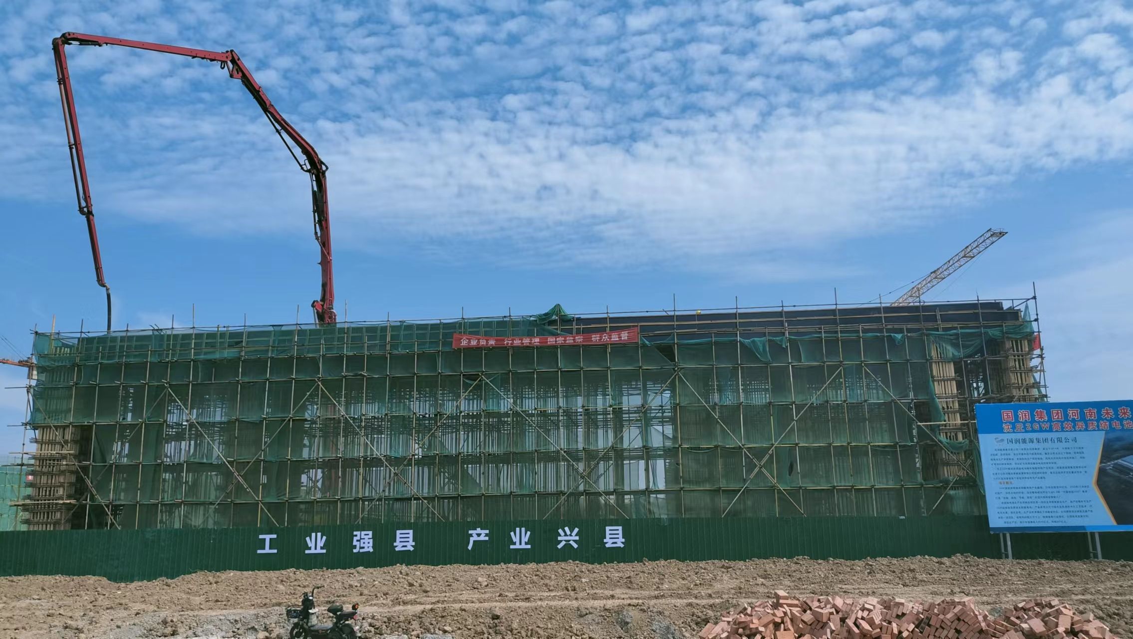 離開標(biāo)準(zhǔn)化廠房建設(shè)工地,記者又來到位于沈丘縣現(xiàn)代科技產(chǎn)業(yè)園內(nèi)的河南未來新能源沈丘2GW高效異質(zhì)結(jié)(HJT)電池綠色智能制造項目工地,那里也是塔吊林立,一片繁忙景象。高端電池生產(chǎn)車間正在緊張施工中,一臺灌漿機(jī)正在澆筑房頂。項目部負(fù)責(zé)人張旭輝說:“正在建設(shè)的是高端太陽能芯片生產(chǎn)車間主廠房面積2.41萬平方米,鋼架5200平方米,10月底完工,11月份安裝設(shè)備?!?/p>