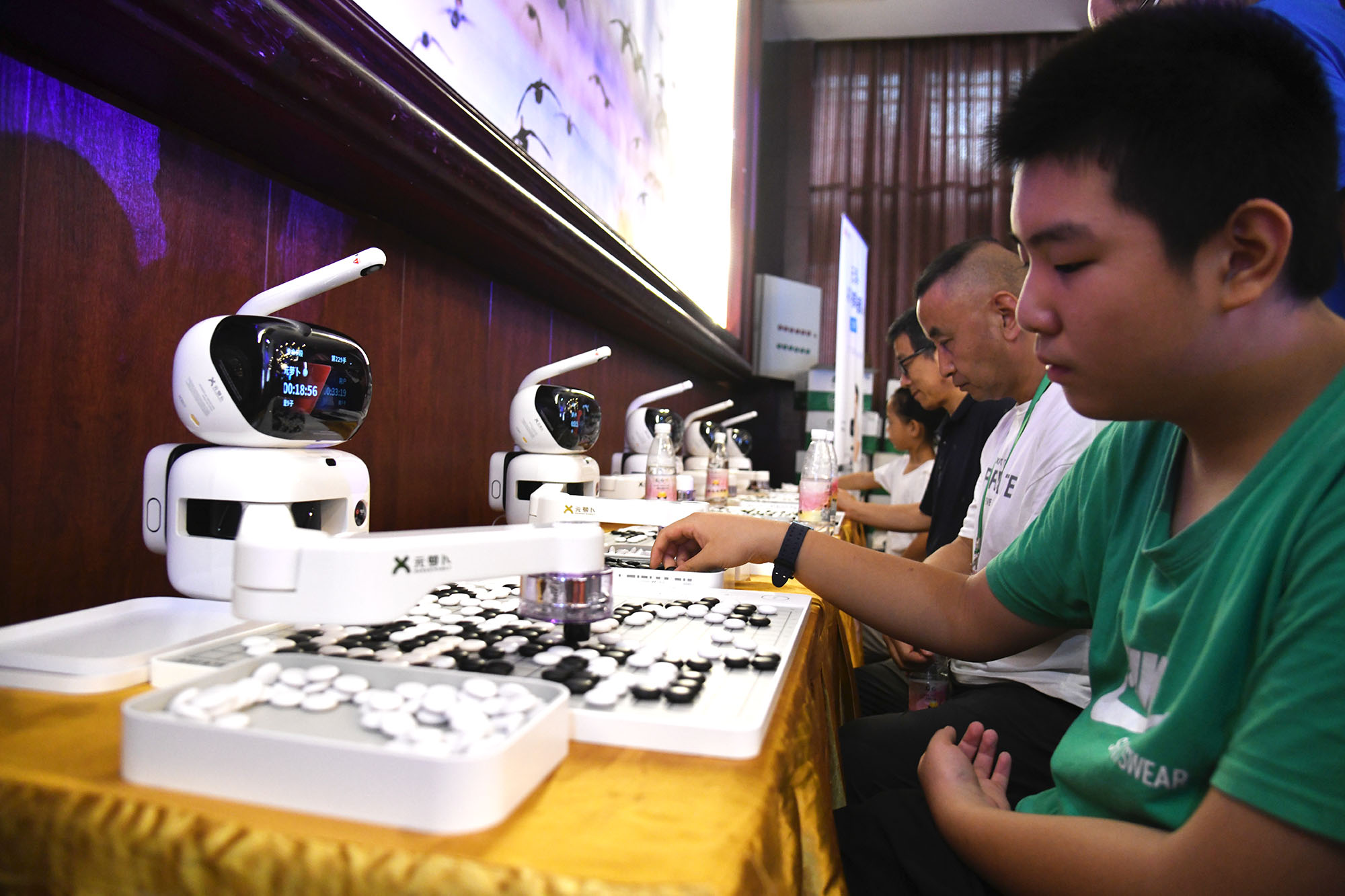 ?8月15日上午,圍棋棋手們?cè)谫愂麻g隙,和機(jī)器人對(duì)弈,增添不少樂(lè)趣。在2023中國(guó)淮陽(yáng)第二屆“荷花杯”全國(guó)業(yè)余圍棋公開(kāi)賽的賽場(chǎng)邊,賽事方特意擺放五部圍棋機(jī)器人,供棋手們?cè)谫愂轮鄪蕵?lè)。工作人員介紹,這些圍棋機(jī)器人很強(qiáng)大,不上網(wǎng)聯(lián)機(jī)的情況下,它們具有業(yè)余圍棋三段水平,如果上網(wǎng)聯(lián)機(jī),則具有職業(yè)九段能力,人機(jī)大戰(zhàn),棋手們未必能贏了機(jī)器人。