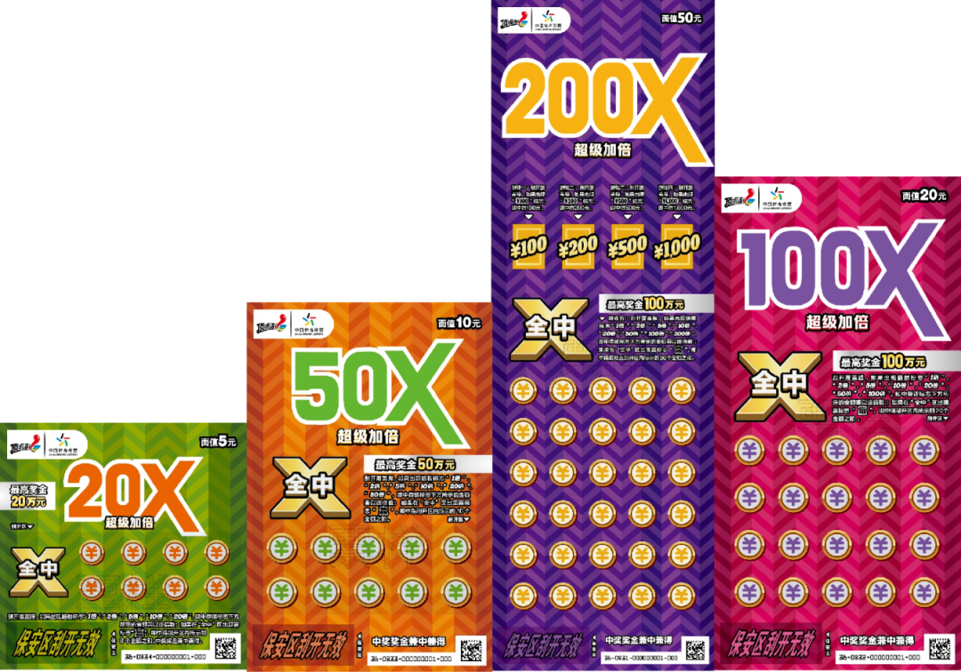 “超級(jí)加倍Ⅱ”系列主題即開(kāi)票(面值:50元、20元、10元、5元)。