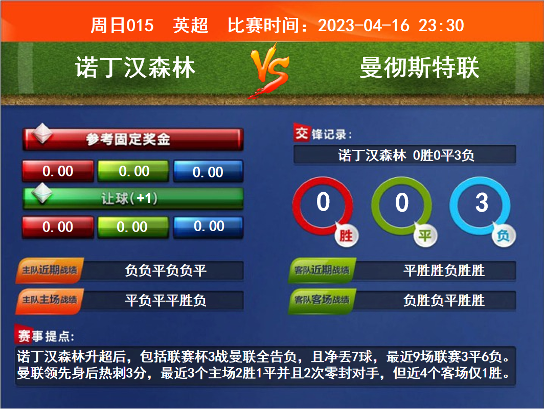 比賽時(shí)間:2023-04-16 23:30賽事提點(diǎn):諾丁漢森林升超后,包括聯(lián)賽杯3戰(zhàn)曼聯(lián)全告負(fù),且凈丟7球,最近9場聯(lián)賽3平6負(fù)。曼聯(lián)領(lǐng)先身后熱刺3分,最近3個(gè)主場2勝1平并且2次零封對手,但近4個(gè)客場僅1勝。