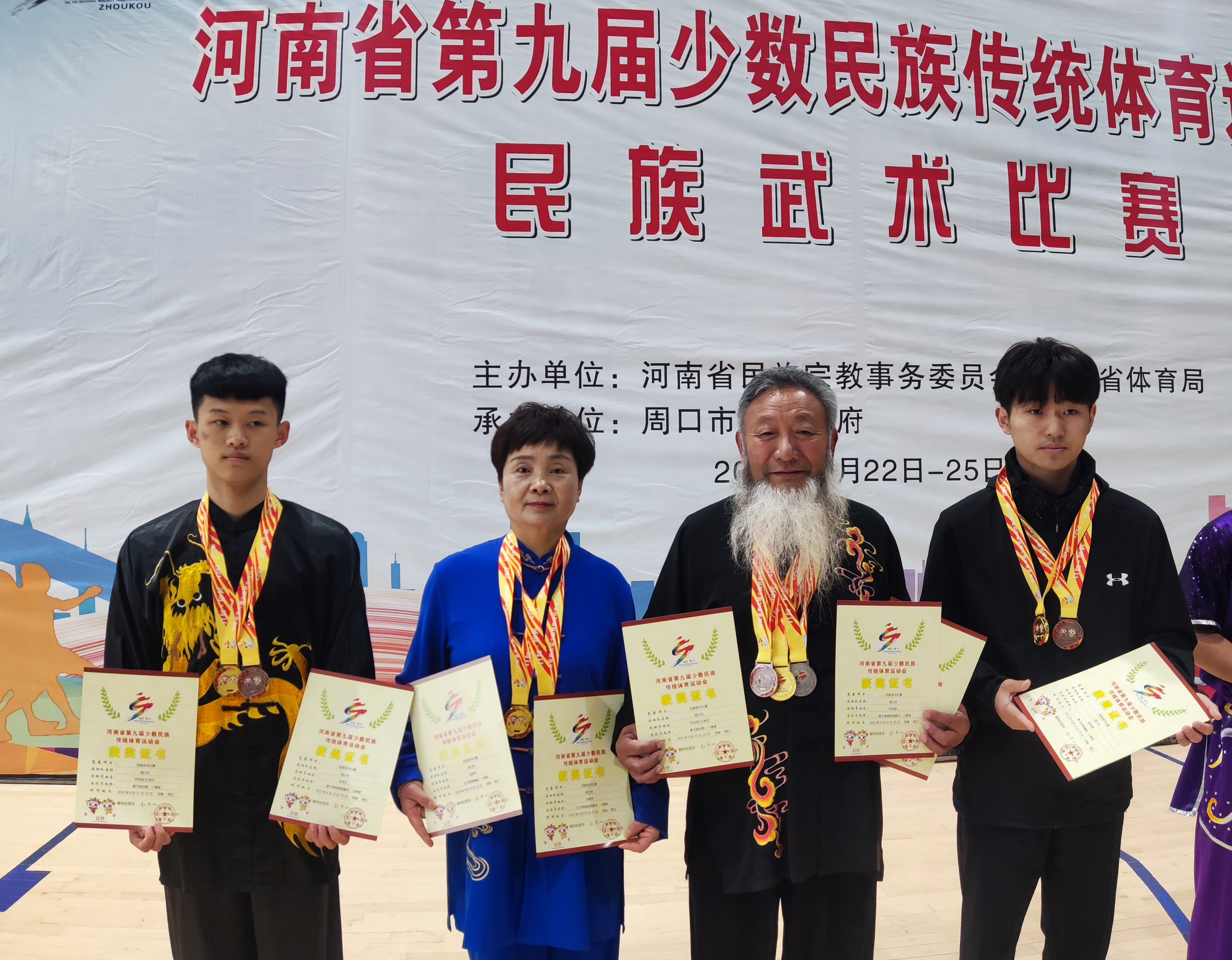 周口隊運動員王詩文、馬艷平、許東陽、蘇俊瑞領(lǐng)取獎牌和證書(從左至右)。