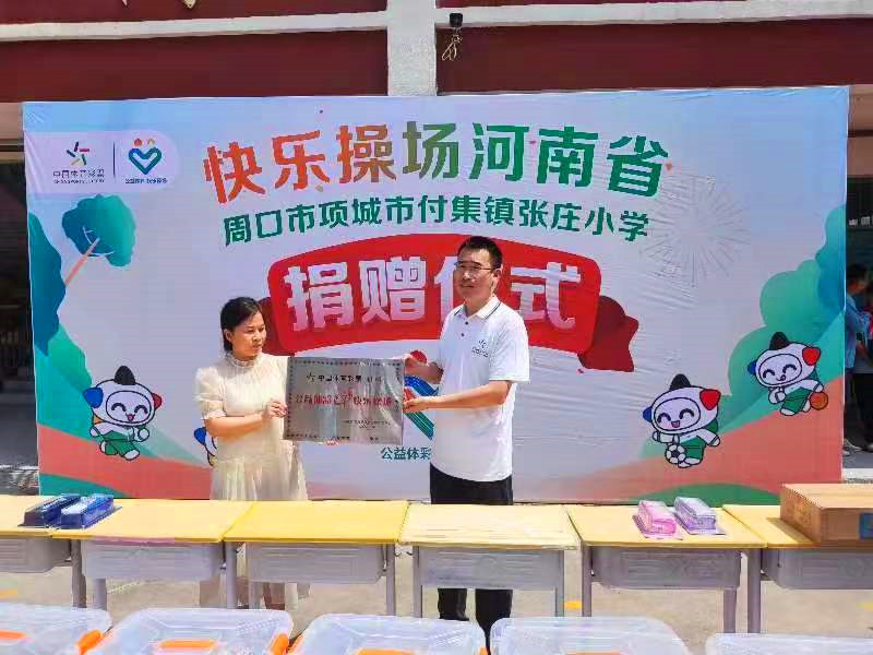 “公益體彩獻(xiàn)愛心,快樂操場(chǎng)進(jìn)校園”。6月20日,“公益體彩 快樂操場(chǎng)”走進(jìn)項(xiàng)城市付集鎮(zhèn)張莊小學(xué)開展公益捐贈(zèng)活動(dòng)。學(xué)校負(fù)責(zé)人將錦旗送到周口體彩分中心副主任孫海永手中,對(duì)該中心的善舉表達(dá)了衷心感謝。