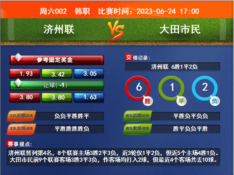 比賽時間:2023-06-24 17:00賽事提點:濟州聯(lián)暫列第4名,8個聯(lián)賽主場3勝2平3負,近3輪僅1平2負,但近5個主場4勝1負。大田市民前9個聯(lián)賽客場3勝3平3負,作客場均打入2球,但最近4個客場共丟10球。