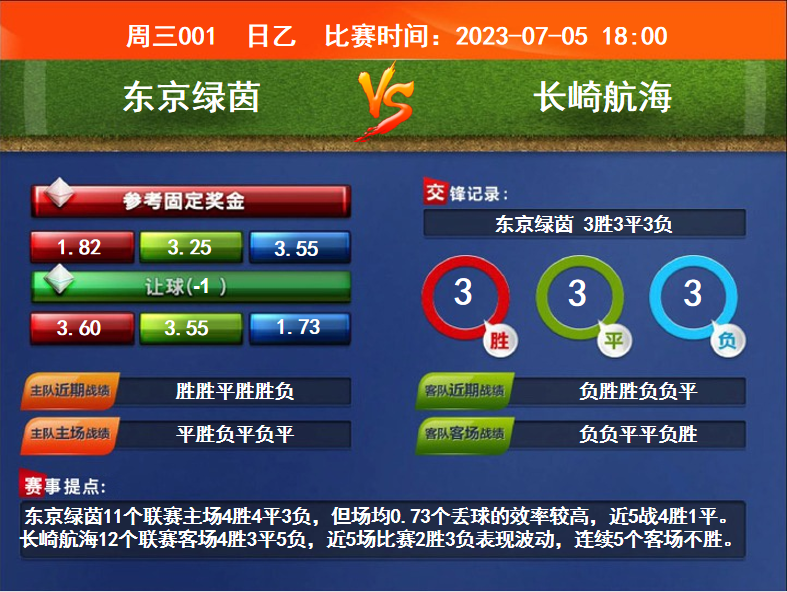 比賽時(shí)間:2023-07-05 18:00賽事提點(diǎn):東京綠茵11個(gè)聯(lián)賽主場(chǎng)4勝4平3負(fù),但場(chǎng)均0.73個(gè)丟球的效率較高,近5戰(zhàn)4勝1平。長(zhǎng)崎航海12個(gè)聯(lián)賽客場(chǎng)4勝3平5負(fù),近5場(chǎng)比賽2勝3負(fù)表現(xiàn)波動(dòng),連續(xù)5個(gè)客場(chǎng)不勝。