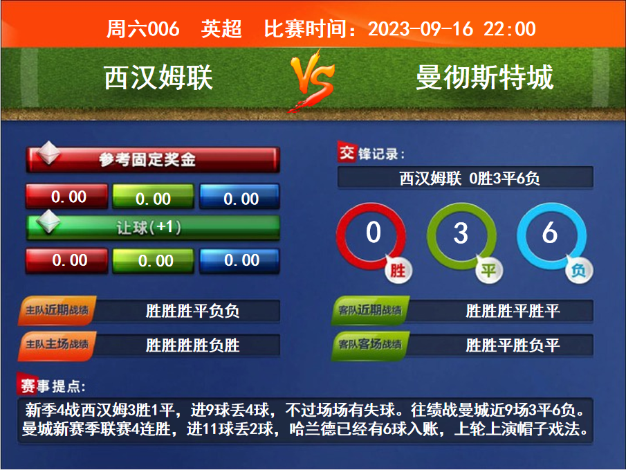 比賽時(shí)間:2023-09-16 22:00賽事提點(diǎn):新季4戰(zhàn)西漢姆3勝1平,進(jìn)9球丟4球,不過(guò)場(chǎng)場(chǎng)有失球。往績(jī)戰(zhàn)曼城近9場(chǎng)3平6負(fù)。曼城新賽季聯(lián)賽4連勝,進(jìn)11球丟2球,哈蘭德已經(jīng)有6球入賬,上輪上演帽子戲法。