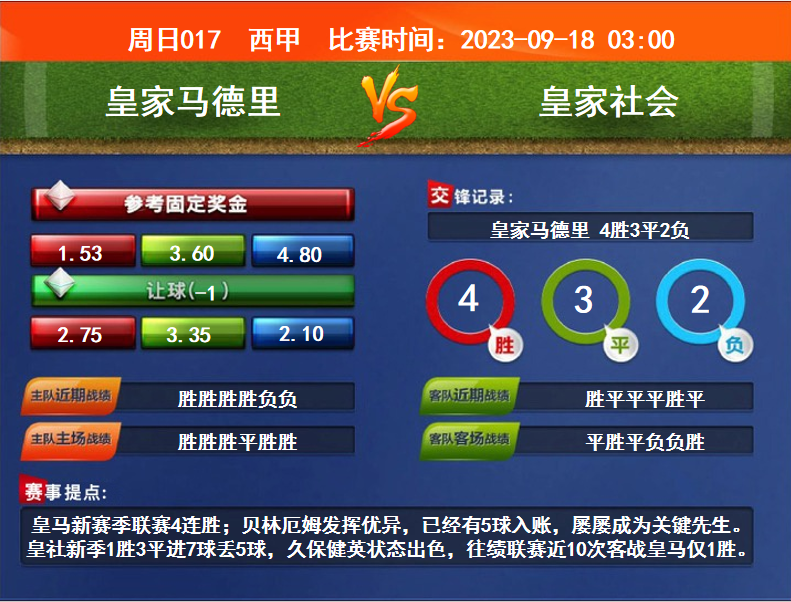 比賽時(shí)間:2023-09-18 03:00賽事提點(diǎn):皇馬新賽季聯(lián)賽4連勝;貝林厄姆發(fā)揮優(yōu)異,已經(jīng)有5球入賬,屢屢成為關(guān)鍵先生。皇社新季1勝3平進(jìn)7球丟5球,久保健英狀態(tài)出色,往績(jī)聯(lián)賽近10次客戰(zhàn)皇馬僅1勝。