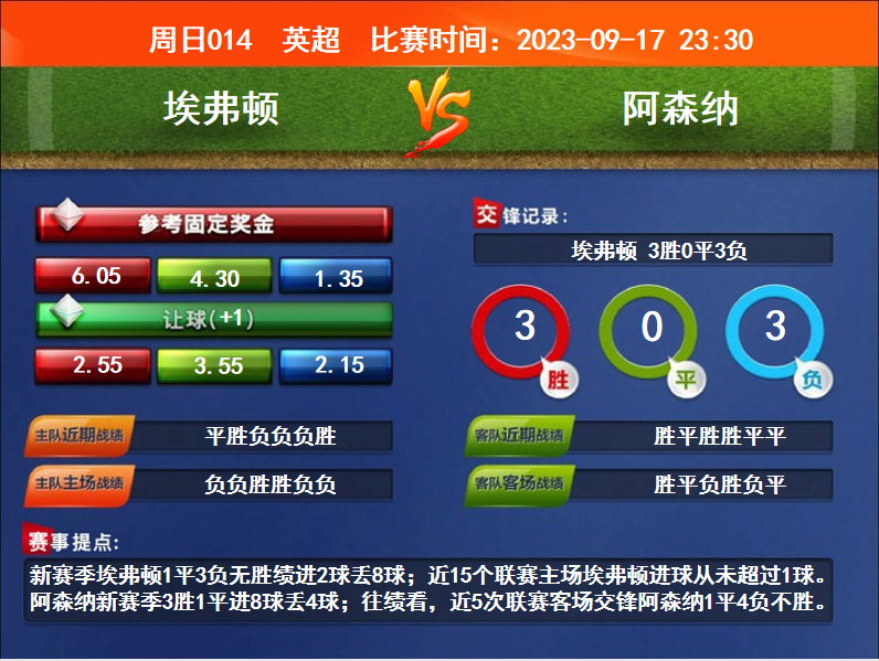 比賽時(shí)間:2023-09-17 23:30賽事提點(diǎn):新賽季埃弗頓1平3負(fù)無(wú)勝績(jī)進(jìn)2球丟8球;近15個(gè)聯(lián)賽主場(chǎng)埃弗頓進(jìn)球從未超過1球。阿森納新賽季3勝1平進(jìn)8球丟4球;往績(jī)看,近5次聯(lián)賽客場(chǎng)交鋒阿森納1平4負(fù)不勝。