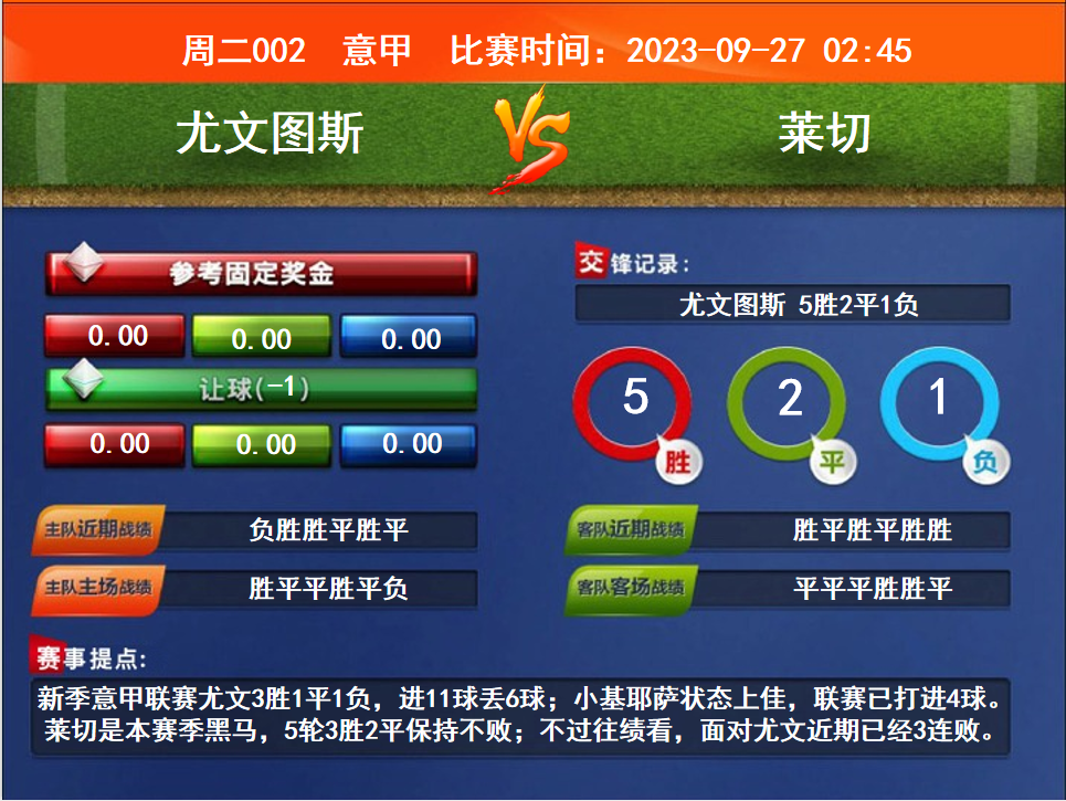 比賽時間:2023-09-27 02:45賽事提點:新季意甲聯(lián)賽尤文3勝1平1負(fù),進(jìn)11球丟6球;小基耶薩狀態(tài)上佳,聯(lián)賽已打進(jìn)4球。萊切是本賽季黑馬,5輪3勝2平保持不??;不過往績看,面對尤文近期已經(jīng)3連敗。