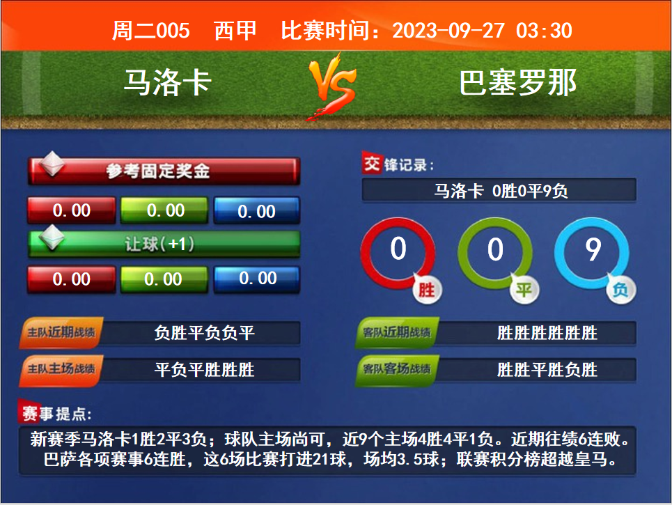 比賽時間:2023-09-27 03:30賽事提點:新賽季馬洛卡1勝2平3負(fù);球隊主場尚可,近9個主場4勝4平1負(fù)。近期往績6連敗。巴薩各項賽事6連勝,這6場比賽打進(jìn)21球,場均3.5球;聯(lián)賽積分榜超越皇馬。