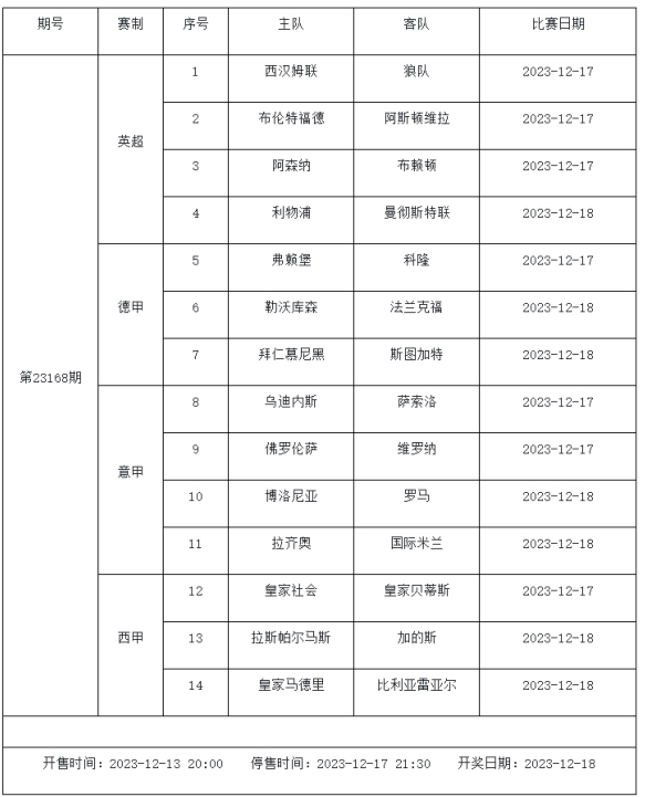 足球彩票勝負(fù)游戲(14場和任選9場)第23168期: