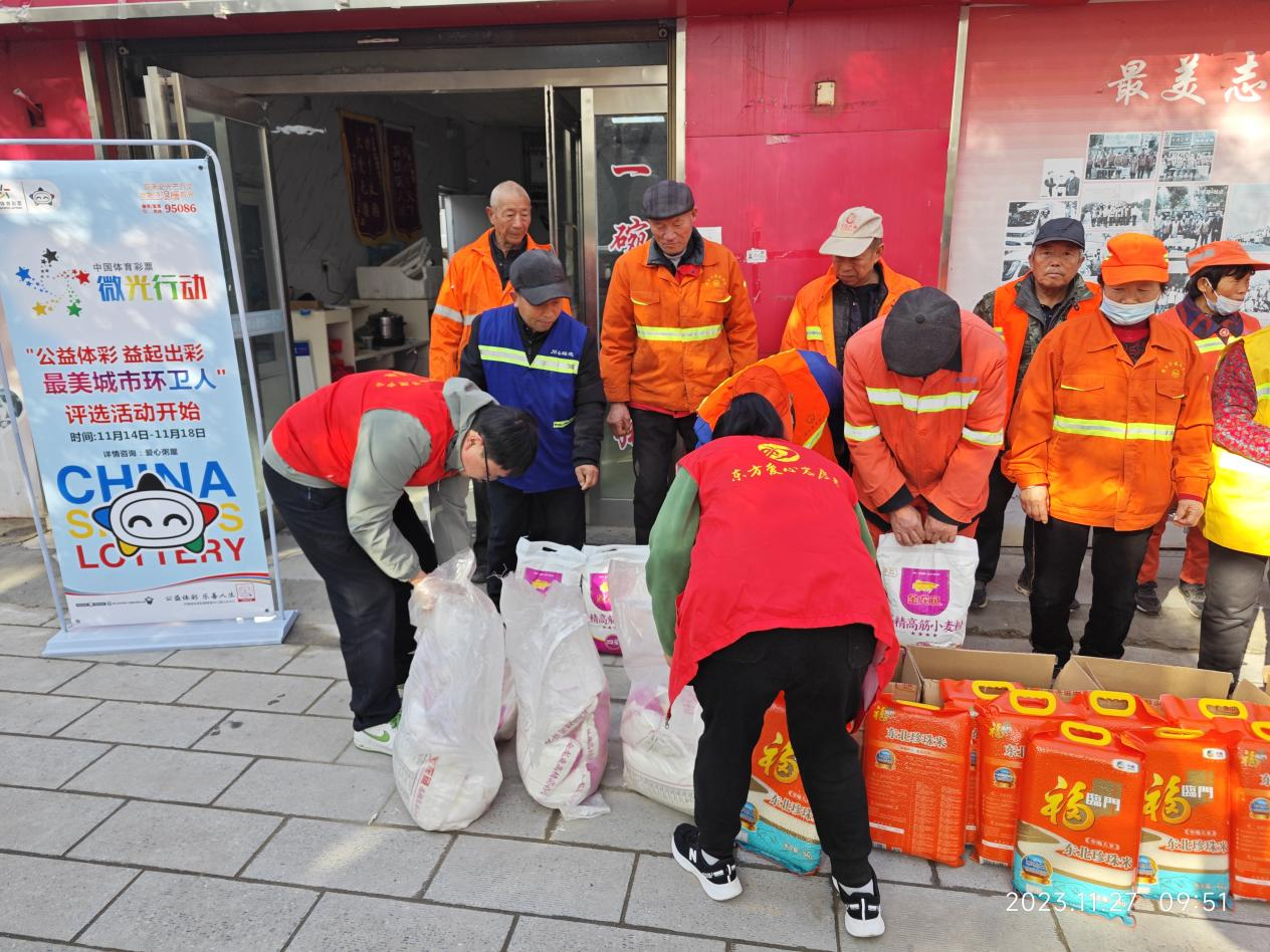 11月27日,周口體彩分中心工作人員攜帶米、面等物資來到“東方愛心粥屋”開展“公益體彩 益起出彩”致敬“城市最美環(huán)衛(wèi)人”活動公益活動,對20名“城市最美環(huán)衛(wèi)人”開展捐助。