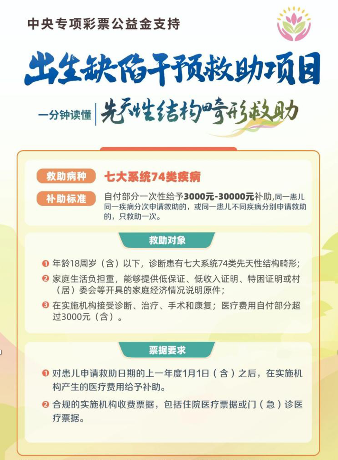 中央專項彩票公益金支持出生缺陷救助項目,旨在向患有遺傳代謝病、先天性結(jié)構(gòu)畸形和功能性出生缺陷等三類出生缺陷疾病的經(jīng)濟困難家庭提供醫(yī)療費用補助,減輕患兒家庭醫(yī)療負(fù)擔(dān)。該項目由衛(wèi)生健康委委托中國出生缺陷干預(yù)救助基金會組織實施。