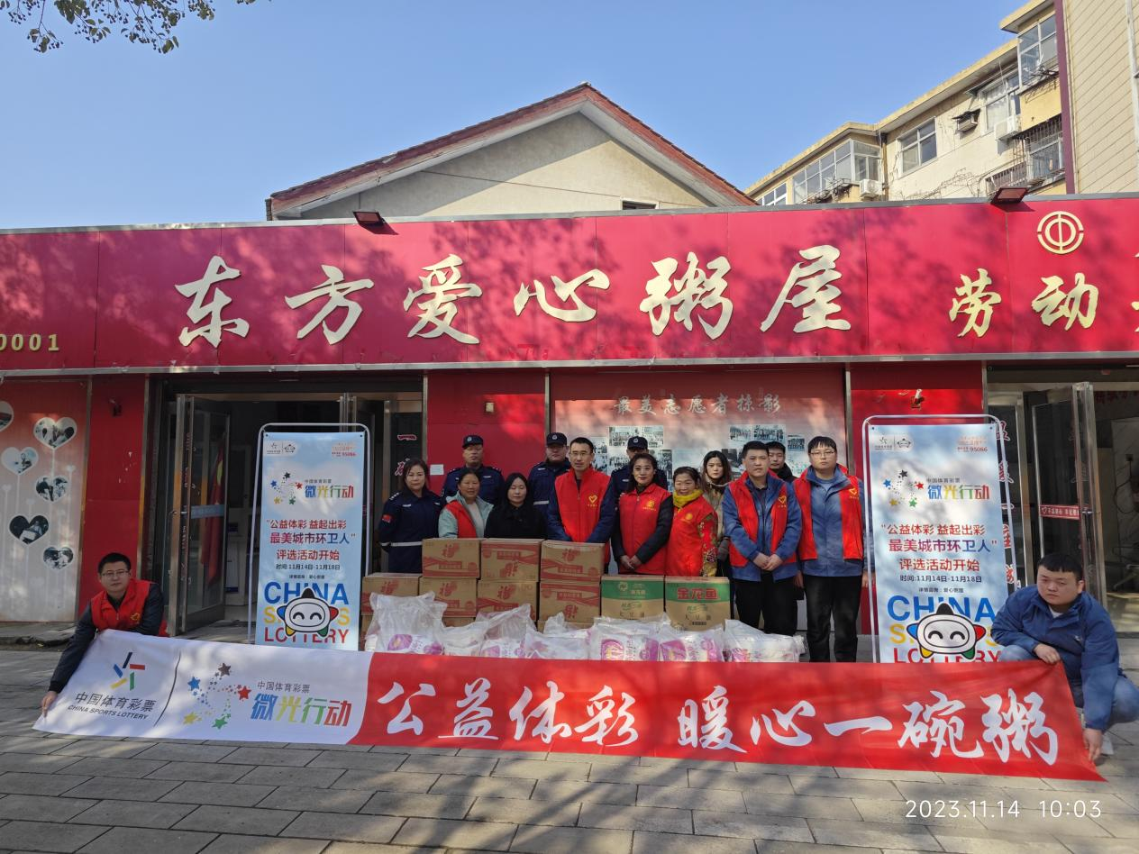 11月27日,周口體彩分中心工作人員攜帶米、面等物資來到“東方愛心粥屋”開展“公益體彩 益起出彩”致敬“城市最美環(huán)衛(wèi)人”活動公益活動,對20名“城市最美環(huán)衛(wèi)人”開展捐助。