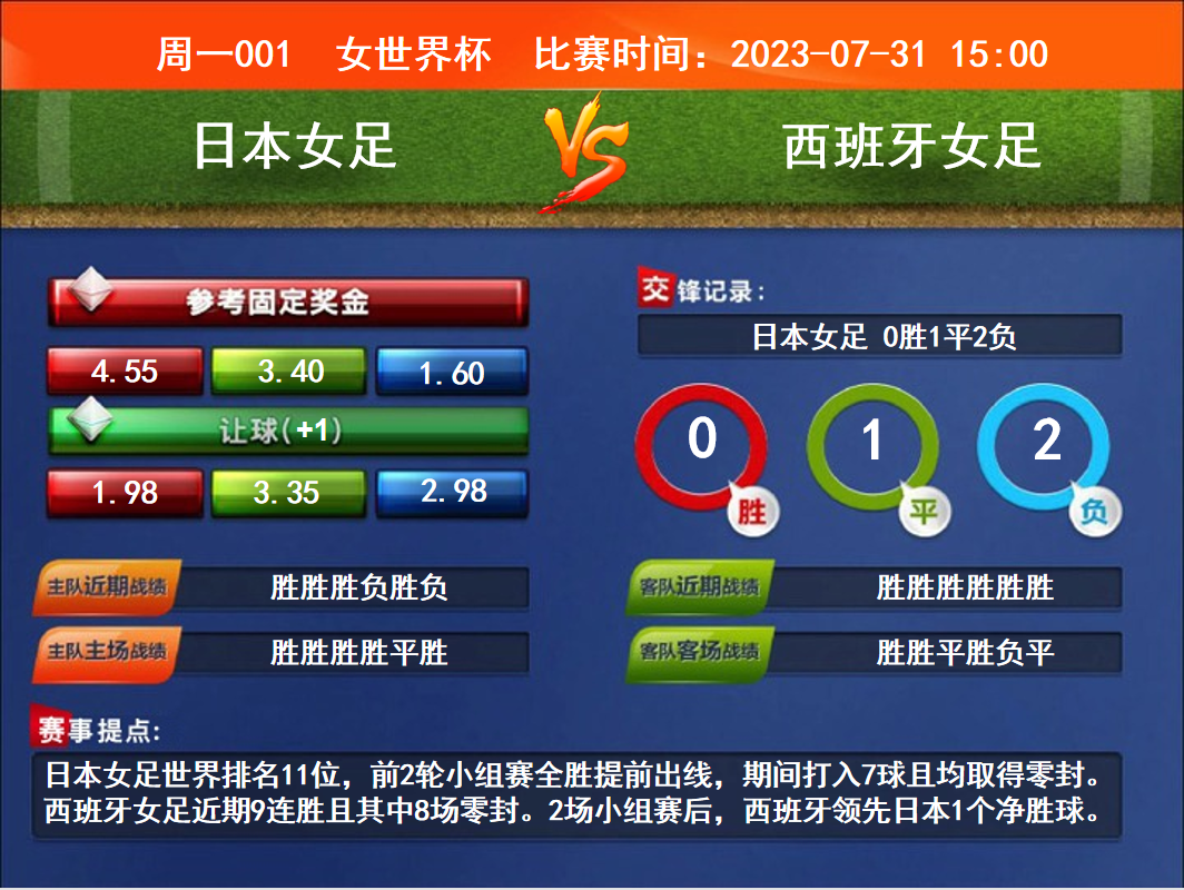 周一競彩足球強(qiáng)檔:日本女足戰(zhàn)勁敵 澳女足生死一線
