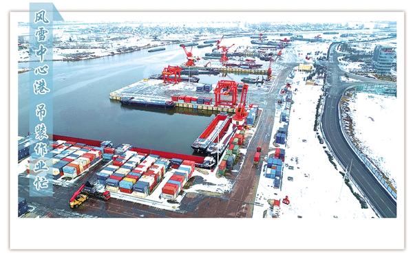 1月21日上午,白雪裝點(diǎn)下的周口中心港范營(yíng)作業(yè)區(qū)一片繁忙景象。碼頭上,運(yùn)輸車輛往來(lái)穿梭,集裝箱吊裝作業(yè)有序進(jìn)行,呈現(xiàn)了新年伊始港口生產(chǎn)的蓬勃?dú)庀蟆?/p>
