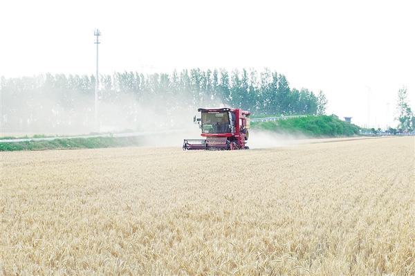 5月26日,在川匯區(qū)華耀城街道葛灣行政村的麥田里,農(nóng)機手駕駛農(nóng)機搶收小麥。