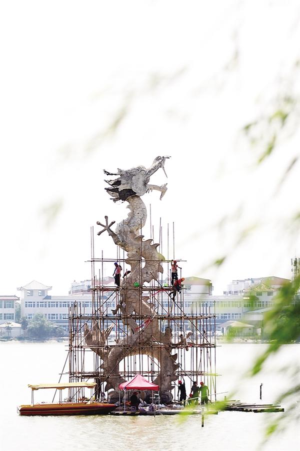 6月5日,建筑工人在搭建腳手架,開始對淮陽龍湖中的9座龍形雕塑進行修繕。